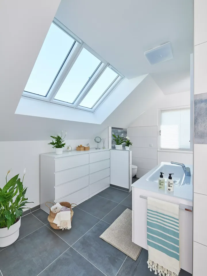 Zum Erhalt der Bausubstanz ist es wichtig, das Badezimmer richtig zu lüften. Planen Sie dafür passende Fenster ein. Sie lassen sich leicht im Dach integrieren und sorgen neben den praktischen Aspekten für eine schöne Optik.