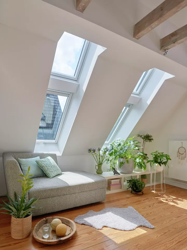 Große Dachfensterflächen lassen Ihren Wohnraum mit Lichtstrahlen durchströmen und eine gemütliche Atmosphäre entstehen.