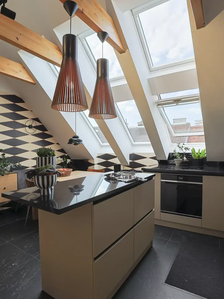Dazu zählen das Lichtspiel, der Ausblick aus dem Dachfenster und das Mobiliar, das Sie in Dachräumen aufgrund der ausgeprägten Winkel besonders eindrucksvoll in Szene setzen können. Die Schrägen hingegen sollten dem Betrachter möglichst entfernt erscheinen – dadurch lassen Sie den Raum offener und größer wirken.