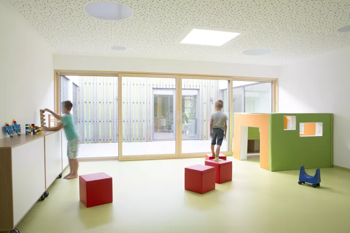 Im Zentrum des Erweiterungsbaus befindet sich ein Atrium, das den Kindern als Freibereich dient und alle angrenzenden Räume zusätzlich mit natürlichem Tageslicht versorgt. Die beiden Gruppenräume, die im Süden nebeneinander situiert sind, werden dadurch von drei beziehungsweise vier Himmelsrichtungen und aufgrund der Raumtiefe zusätzlich von oben belichtet. Die Flachdach-Fenster unterstützen die optimale Ausleuchtung auch in den Gängen, den Garderoben der Kinder und im Multifunktionsraum.