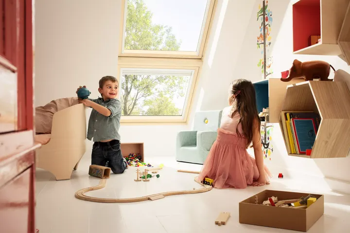 Oft befindet sich das Kinderzimmer im Dachgeschoss. Hier können Eltern durch die Wahl der Dachfenstervariante schon für ein Plus an Sicherheit sorgen. Bei Schwingfenstern etwa ist die Griffleiste zum Öffnen des Fensters ganz oben angebracht. Da die Mindesteinbauhöhe, gemessen von der unteren Kante des Dachfensters, bei 90 Zentimeter liegt und damit der Griff zum Öffnen bei jeder Fenstergröße noch deutlich höher, ist das Fenster für kleinere Kinder sowieso außer Reichweite.
