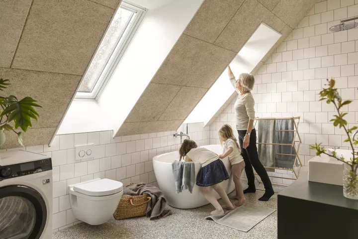 - Toilette unter Dachfenster: Wenn für das WC unter der Dachschräge die Mindesthöhe zum Sitzen oder Stehen nicht erreicht wird, ist der Einbau eines Dachfensters direkt über der Toilette eine einfache Lösung mit vielen Vorteilen. Durch Einbautiefe des Dachfensters gewinnt der Raum an dieser Stelle an Höhe – und Sie können sich beim Toilettengang über mehr Kopffreiheit freuen.