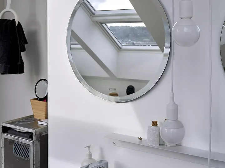 - Wenn Ihr Spiegel die ganze Fläche bis zur Schräge nutzen soll, empfehlen sich meist schräg angeschnittene Maßanfertigungen, aber auch runde Spiegel können sich gut eignen.